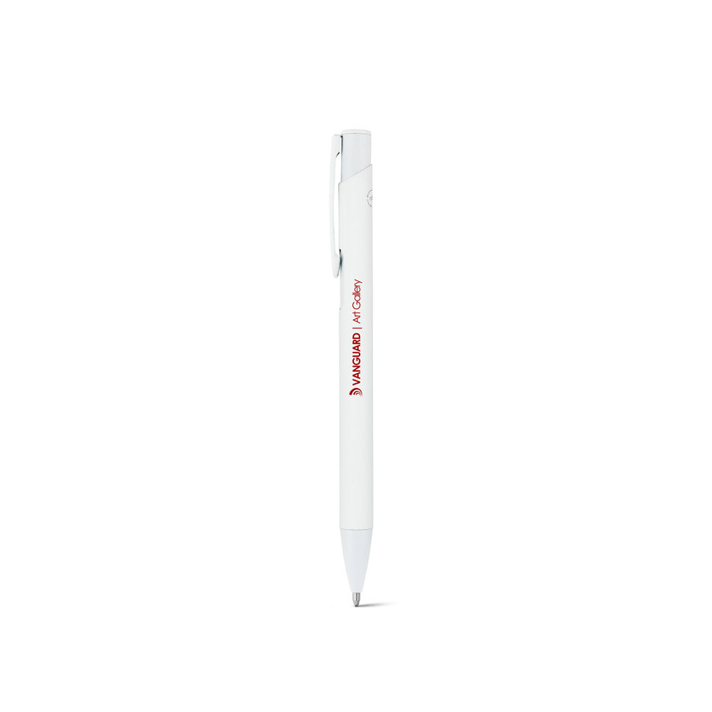 Esferográfica em alumínio 100% reciclado, com acabamento em borracha. Escrita em azul até 1,5 km.