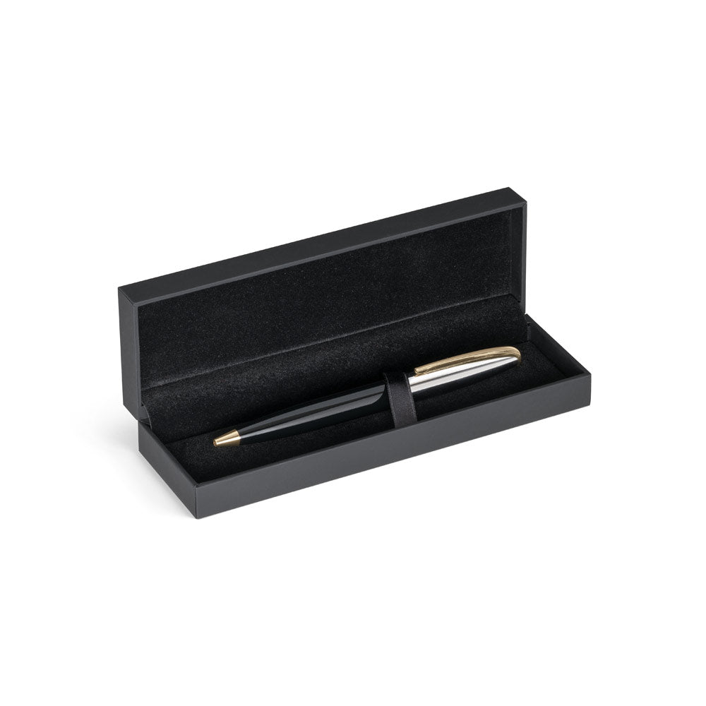 Esferográfica em metal. Possui um clipe, anel e ponteira com banho de ouro de 18 quilates. Escrita em preto até 1,5 km. Fornecida em estojo presente almofadado.