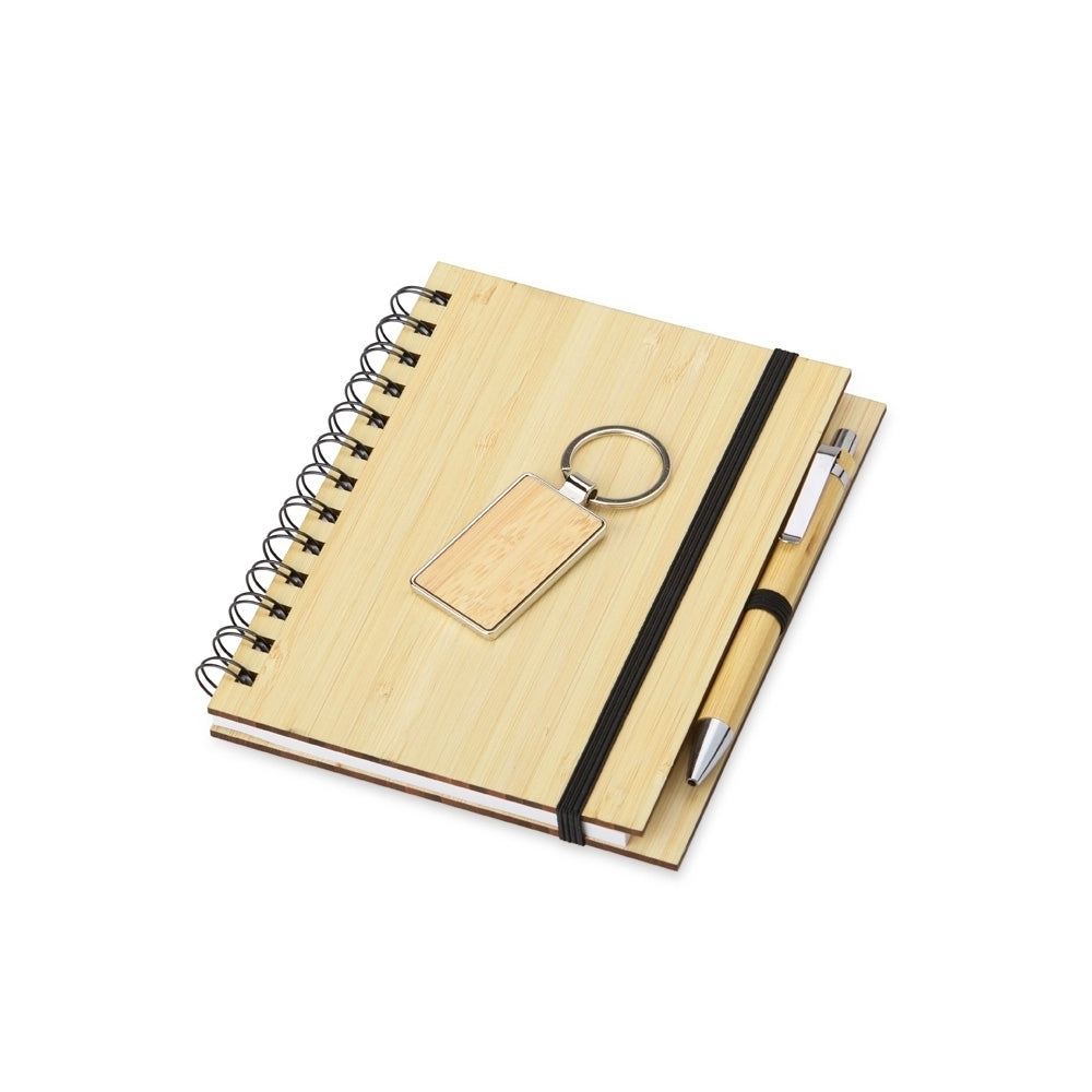 Kit executivo ecológico 3 peças em estojo de papelão. Contém: chaveiro de bambu com detalhe em metal, caderneta em bambu, capa dura, com aproximadamente 65 folhas brancas pautadas, caneta de bambu com clipe metálico, elástico para lacre e suporte para caneta em nylon.